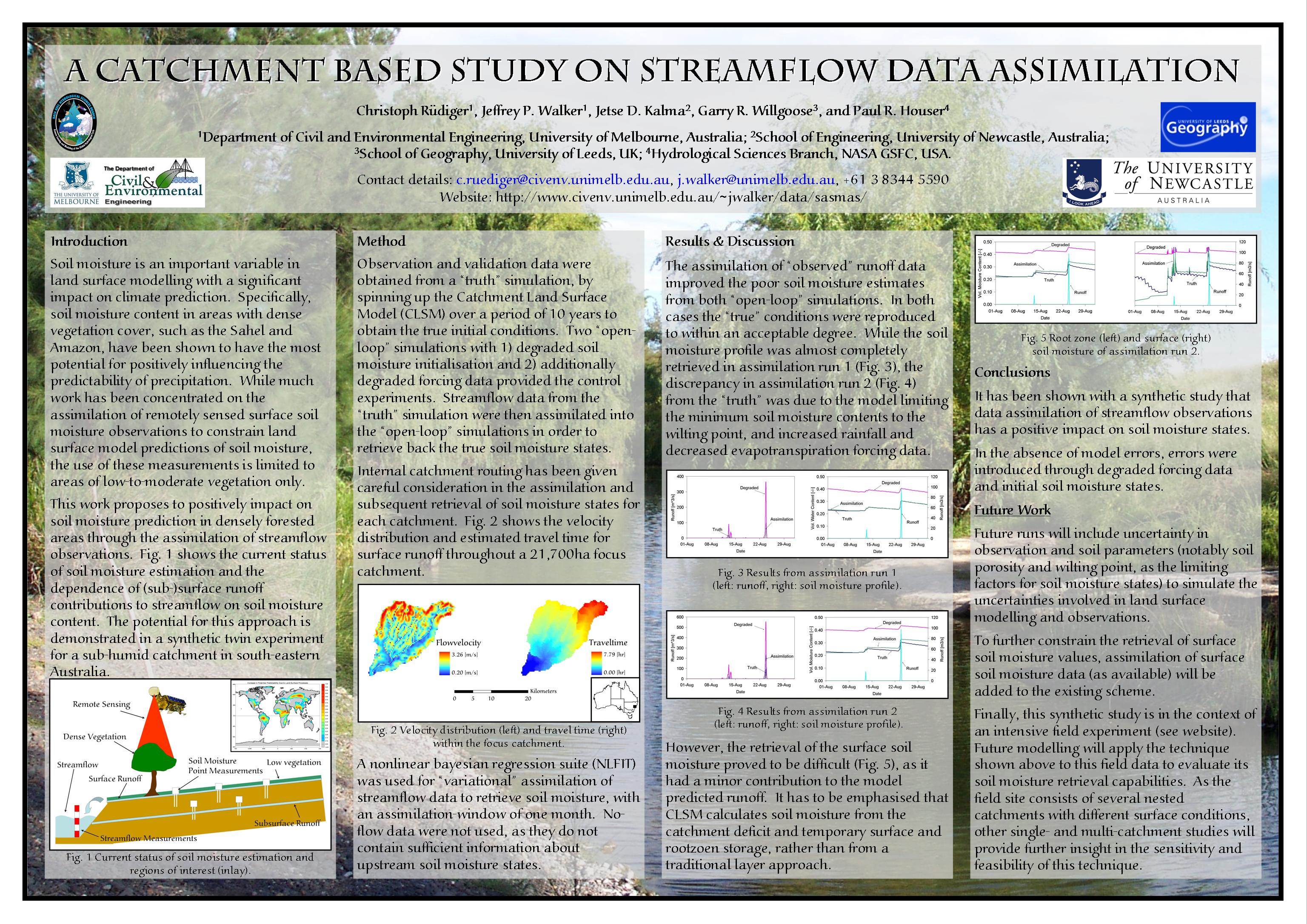 Wells T, Hancock GR, Dever C, Murphy D. 2012. Prediction of vertical soil organic carbon profiles using soil properties and environmental tracer data at an untilled site , Geoderma, 170, 337-346(1345 kB) Hancock GR, Coulthard TJ, Martinez C , Kalma JD., 2011. An evaluation of Landscape Evolution Models to simulate decadal and centennial scale soil erosion in grassland catchments, Journal of Hydrology, Journal of Hydrology 398 (2011) 171-183. Hancock GR, Coulthard TJ. 2011., Channel movement and erosion response to rainfall variability in southeast Australia, Hydrological Processes, DOI: 10.1002/hyp.8166. Martinez C, Hancock G, Kalma J. 2010. Relationships between 137Cs and soil organic carbon (SOC) in cultivated and never cultivated soils: An Australian example, Geoderma, 158: 137-147. Cohen S, Willgoose GR, Hancock GR. 2010. The mARM3D spatially distributed soil evolution model: Three dimensional model framework and analysis of hillslope and landform responses, Journal of Geophysical Research, 115, F04013, doi:10.1029/2009JF001536. Hancock GR, Murphy D, Evans KG. 2010. Hillslope and catchment scale soil organic carbon concentration: an assessment of the role of geomorphology and soil erosion in an undisturbed environment, Geoderma, 155: 36-45. Cohen S, Willgoose GR, Hancock GR. 2009. The mARM spatially distributed soil evolution model: A computationally efficient modeling framework and analysis of hillslope soil surface organization, J. Geophys. Res., 114, F03001, doi:10.1029/2008JF001214. Martinez C, Hancock GR, Kalma J. 2009. Comparison of fallout radionuclide (caesium-137) and modelling approaches for the assessment of soil erosion rates for an uncultivated site in south- eastern Australia, Geoderma, 151:128-140. Martinez C, Hancock GR, Kalma JD, Wells T, Boland L. 2008. An assessment of digital elevation models (DEMs) and their ability to capture geomorphic and hydrologic properties at the catchment scale, International Journal of Remote Sensing, accepted November, 2008. Cohen S, Willgoose G, Hancock GR. 2008. A methodology for calculating the spatial distribution of the area-slope equation and the hypsometric integral within a catchment, Journal of Geophysical Research – Earth Surface, 113, F03027, doi:10.1029/2007JF000820. Wells T, Willgoose GR, Hancock GR. 2008. Modelling weathering pathways and processes of the fragmentation of salt weathered quartz-chlorite schist, Journal of Geophysical Research – Earth Surface, 113, F01014, doi:10.1029/2006JF000714. Wells T, Hancock GR, Fryer J. 2007 Using laboratory simulations and gravestone measurements to estimate rates of sandstone weathering in the Hunter valley, New South Wales, Australia, Environmental Geology, 10.1007/s00254-007-0871-y. Saco PM, Willgose GR, Hancock GR. 2007. Ecohydrology of banded vegetation patterns in arid and semi arid regions, Hydrological and Earth System Science, 11, 1717-1730. Martinez, C., Hancock, G.R., Kalma, J.D., and Wells, T., 2007. Spatio-temporal distribution of near-surface and root zone soil moisture at the catchment scale, Hydrological Processes, DOI: 10.1002/hyp.6869, 2007. (33 kB) Rüdiger, C., Hancock, G., Hemakumara H.M., Jacobs, B., Kalma, J.D.,Martinez, C., Thyer, M., Walker, J.P., Wells, T., and Willgoose, G.R., 2007. Goulburn River experimental catchment data set, Water Resources Research, VOL. 43, doi:10.1029/2006WR005837, 2007. (33 kB) Hancock GR, Martinez, C, Evans KG, Moliere DR. 2006. A comparison of SRTM and high-resolution digital elevation models and their use in catchment geomorphology and hydrology – Australian examples, Earth Surface Processes and Landforms, 31,809-824. Rüdiger, C., Walker, J.P. , Kalma, J.D., Willgoose, G.R., and P. R. Houser, 2005. Streamflow Assimilation: On the effect of model biases, EGU General Assembly, Vienna, April 2006. (33 kB) Rüdiger, C., Walker, J.P. , Kalma, J.D., Willgoose, G.R., and P. R. Houser, 2005. Root Zone Soil Moisture Retrieval Using Streamflow and Surface Soil Moisture Data Assimilation, in: MODSIM 2005 International Congress on Modelling and Simulation, Zerger, A. and Argent, R.M. (eds),Modelling and Simulation Society of Australia and New Zealand, Inc., 12-15 December, 2005, pp 1458-1464. (325 kB) Willgoose, G., Hemakumara, M., Kalma, J. Walker, J., and C.Rüdiger, 2005. The spatial and temporal distribution of point scale soil water in a semi-arid catchment and some implications for catchment scale predictability, Geophysical Research Abstracts 7, 04970. (30 kB) Rüdiger, C., Walker, J. P., Kalma, J. D., Willgoose, G. R., and P. R. Houser, 2005. Assimilation of Streamflow and Surface Soil Moisture Observations into a Land Surface Model, EGU General Assembly, Vienna, April 2005. (2 kB) Rüdiger, C., Walker, J. P., Kalma, J. D., Willgoose, G. R., and P. R. Houser, 2004. Streamflow data assimilation: A study on nested catchments, in Proceedings of the 2nd international CAHMDA workshop on: The Terrestrial Water Cycle: Modelling and Data Assimilation Across Catchment Scales, edited by A.J. Teuling, H. Leijnse, P.A. Troch, J. Sheffield and E.F. Wood, pp. 140-143, Princeton, NJ, October 25-27, 2004.(124 kB), Poster (1.2 MB) Jacobs, B., Kalma, J.D., Hancock, G., Hemakumara, H. M., Walker, J. P., and G. R. Willgoose, 2004. Towards understanding the spatial and temporal distribution and dynamics of soil organic carbon within a large temperate agricultural catchment, in Proceedings of the 2nd international CAHMDA workshop on: The Terrestrial Water Cycle: Modelling and Data Assimilation Across Catchment Scales, edited by A.J. Teuling, H. Leijnse, P.A. Troch, J. Sheffield and E.F. Wood, pp. 105-108, Princeton, NJ, October 25-27. (72 kB) Hemakumara, H.M., Kalma, J.D., Walker, J.P., and G. R. Willgoose, 2004. Downscaling of low resolution passive microwave soil moisture observations, in Proceedings of the 2nd international CAHMDA workshop on: The Terrestrial Water Cycle: Modelling and Data Assimilation Across Catchment Scales, edited by A.J. 